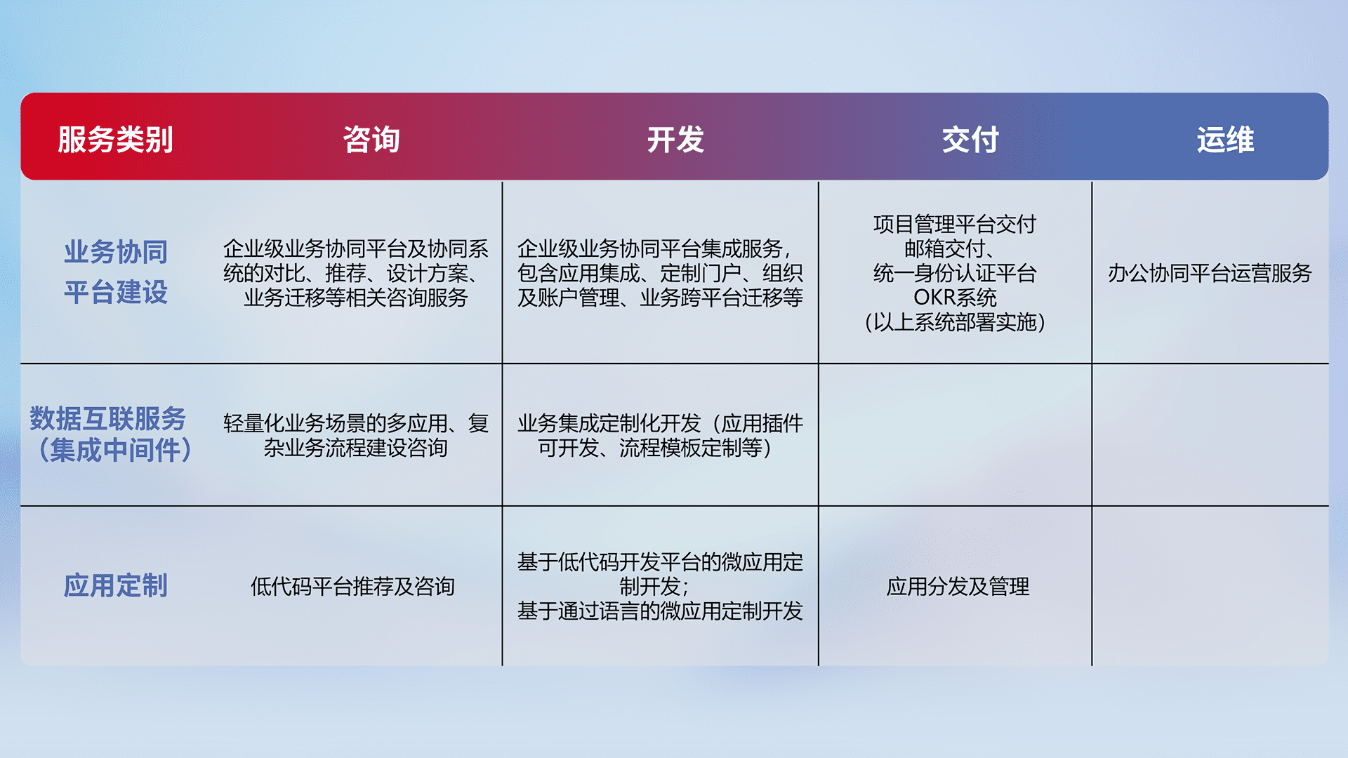 针对钉钉、、、企微、、IDaas等平台级产品提供产品的规划、、、、方案、、交付、、、定制化开发等服务,,,,实现如统一协同办公、、、、智能客户服务、、、混合会议管理、、、智能数据查询、、、、等业务场景,,实现数字化转型。。