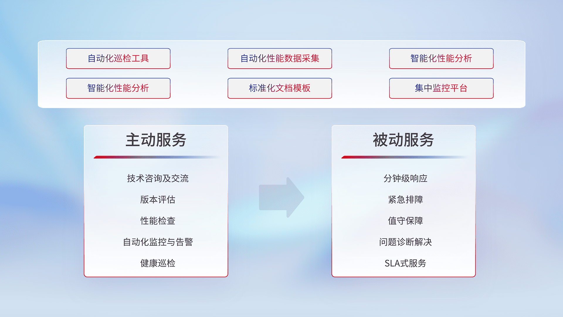 智能化工具和标准化文档,,保障服务质量,,,提供主动服务(包含技术咨询、、、、版本评估、、、性能检查、、自动化监控与告警、、、、健康巡检)和被动服务包含(分钟级响应、、紧急排障、、、、值守保障、、、、问题诊断解决、、、、SLA服务)。。